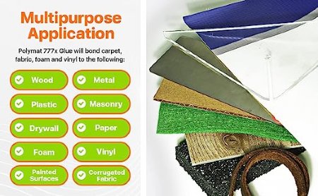 • Bonds carpet, fabric, foam, and vinyl to wood, metal, plastic, masonry, non-wovens, painted surfaces, drywall, fabric, paper, foam and vinyl.